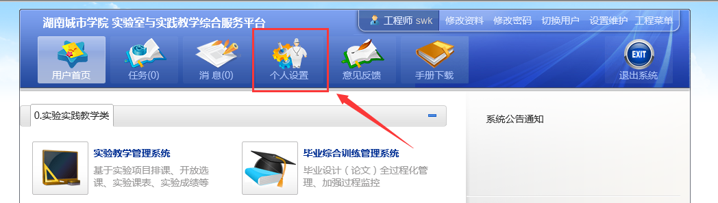 登录进系统后点击“个人设置”,进入个人信息维护界面。
